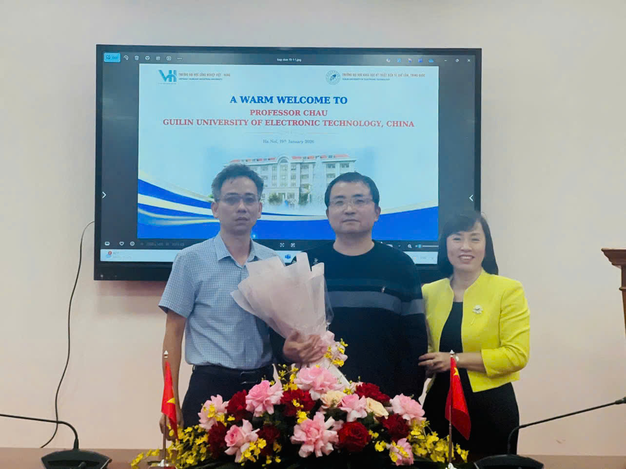 Chiều ngày 19/01/2026, trong khuôn khổ chương trình hợp tác giữa Trường Đại học Công nghiệp Việt - Hung và Đại học Khoa học Kỹ thuật Điện tử Quế Lâm (Trung Quốc), Nhà trường vui mừng đón tiếp GS. Châu sang thăm và làm việc tại cơ sở Tây Phương.