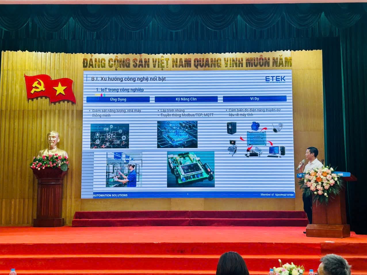 Trong phần tham luận chuyên đề, đại diện Công ty Cổ phần Tự động hóa Etek cùng các doanh nghiệp khách mời đã trình bày về xu hướng công nghệ mới trong ngành Điện – Điện tử, đặc biệt là IoT, năng lượng tái tạo, PLC, SCADA – những lĩnh vực then chốt trong kỷ nguyên 4.0. Bài tham luận mang đến nhiều kiến thức cập nhật, hữu ích cho giảng viên và sinh viên.