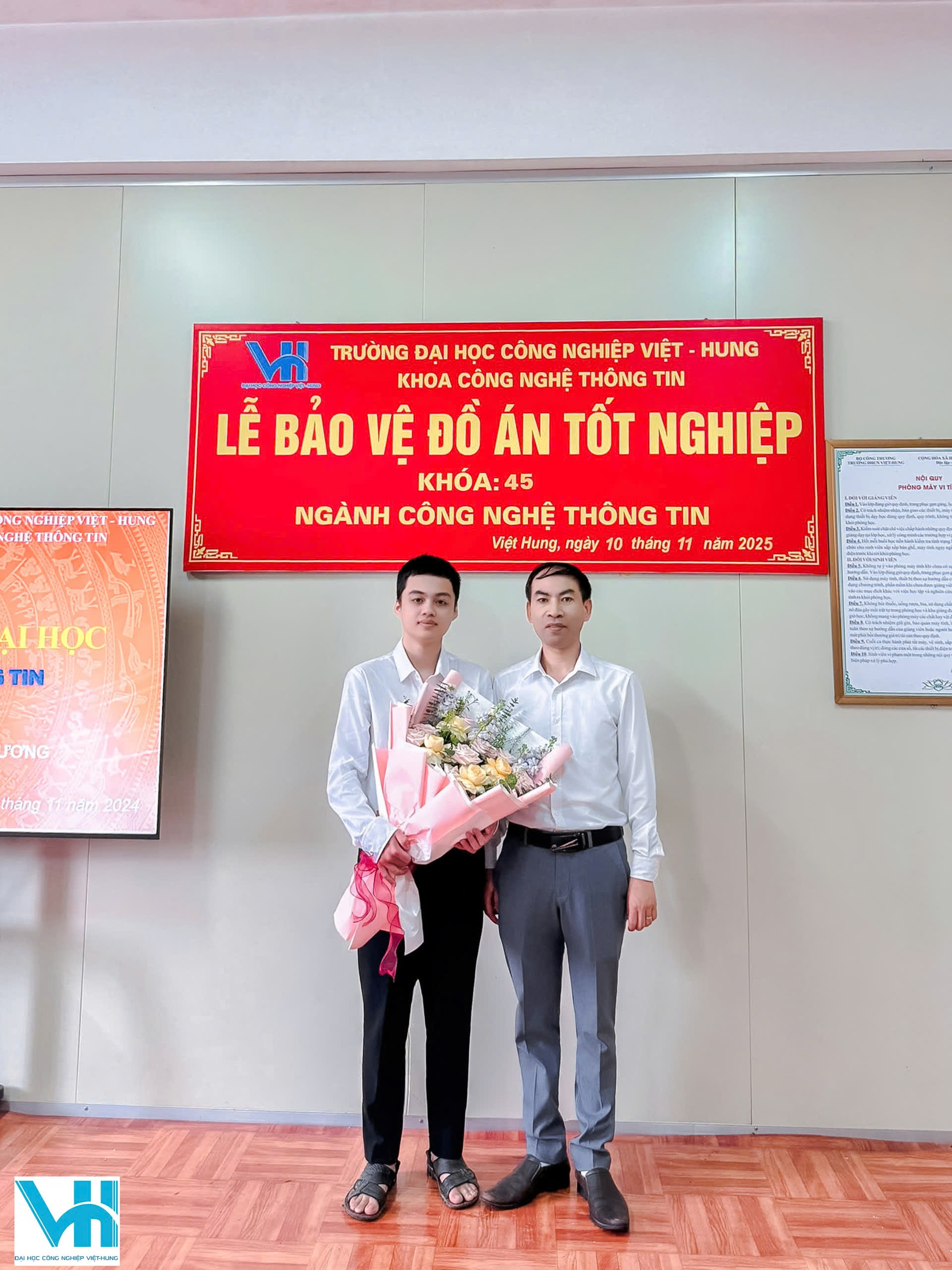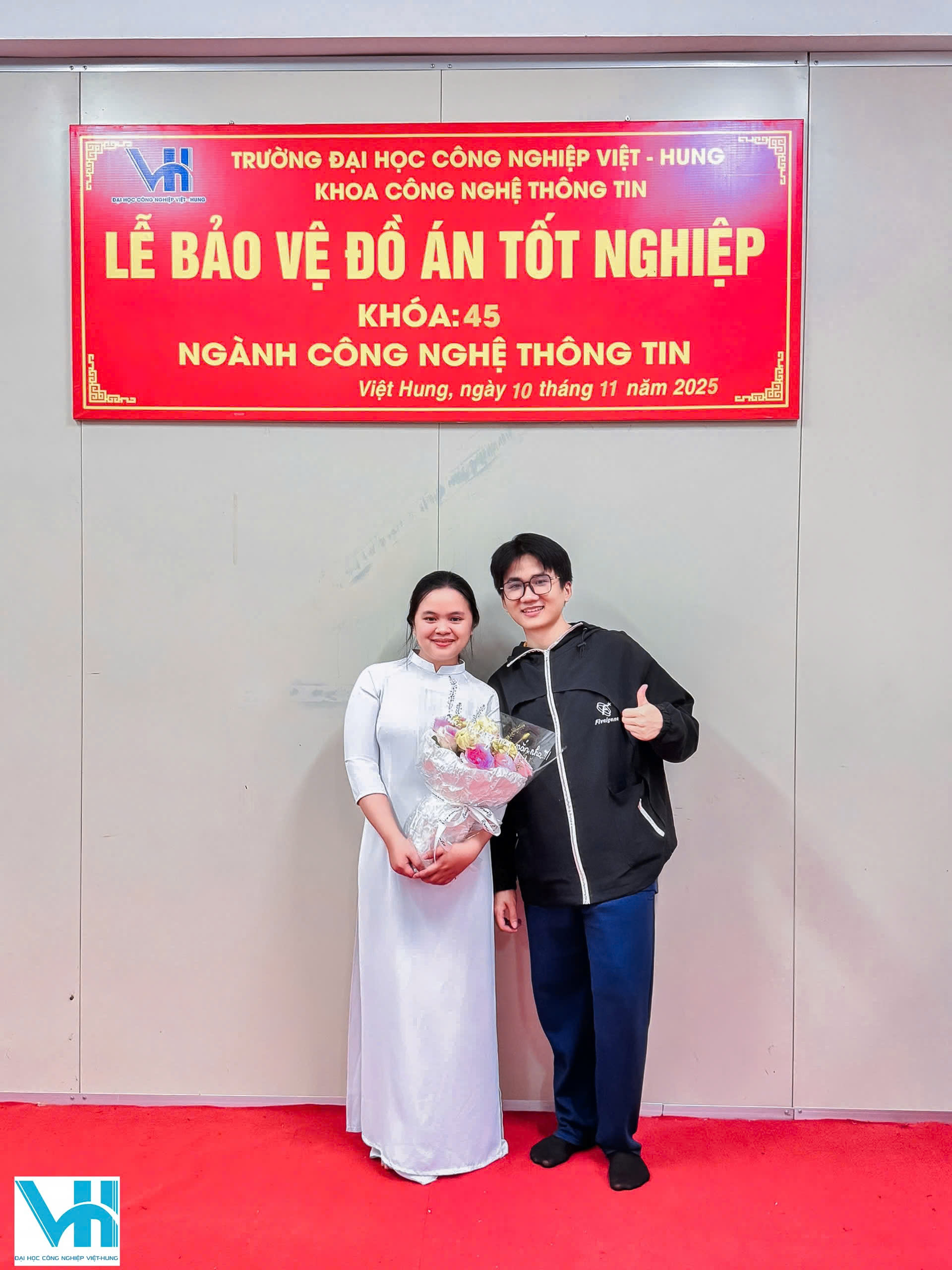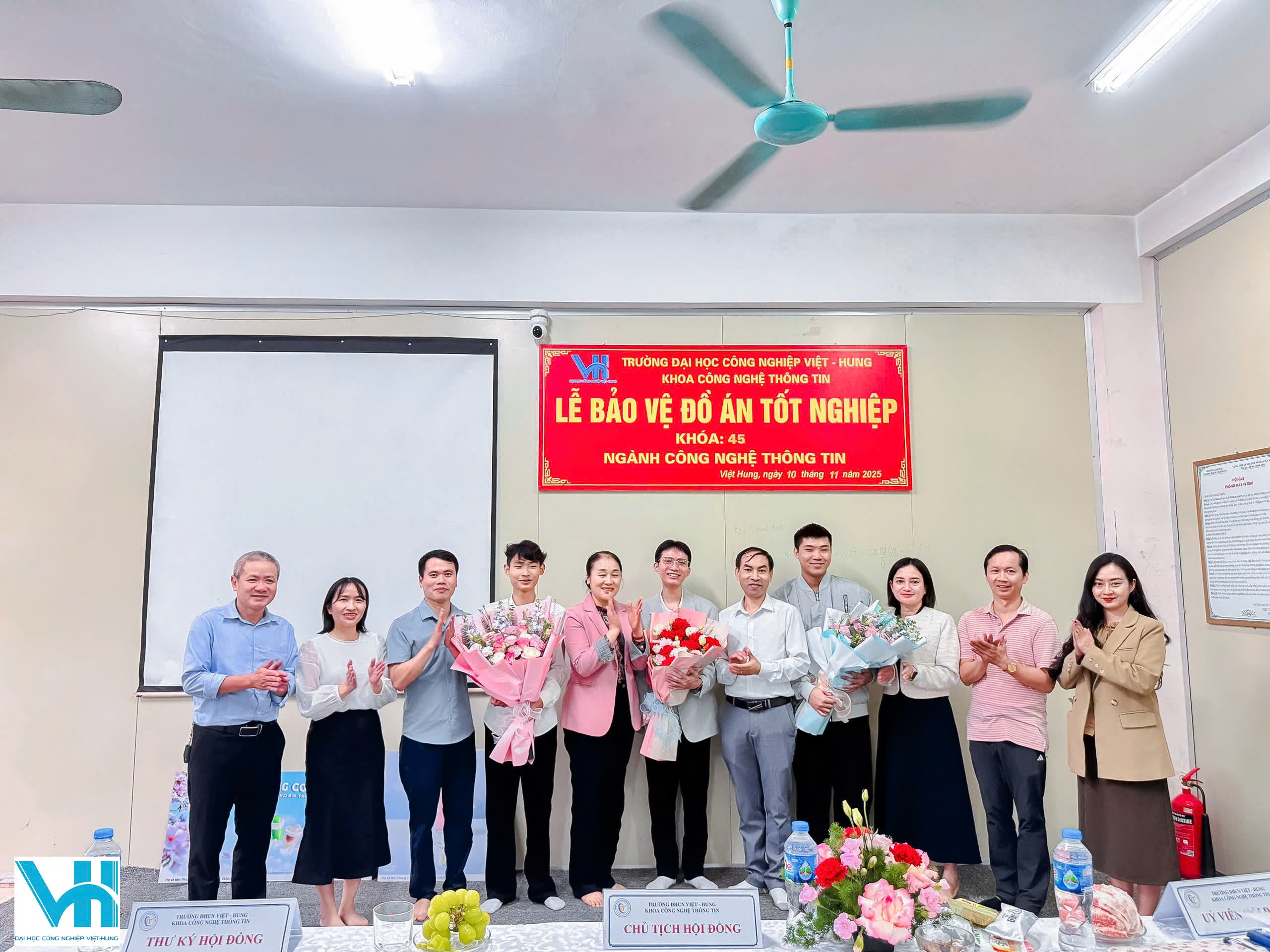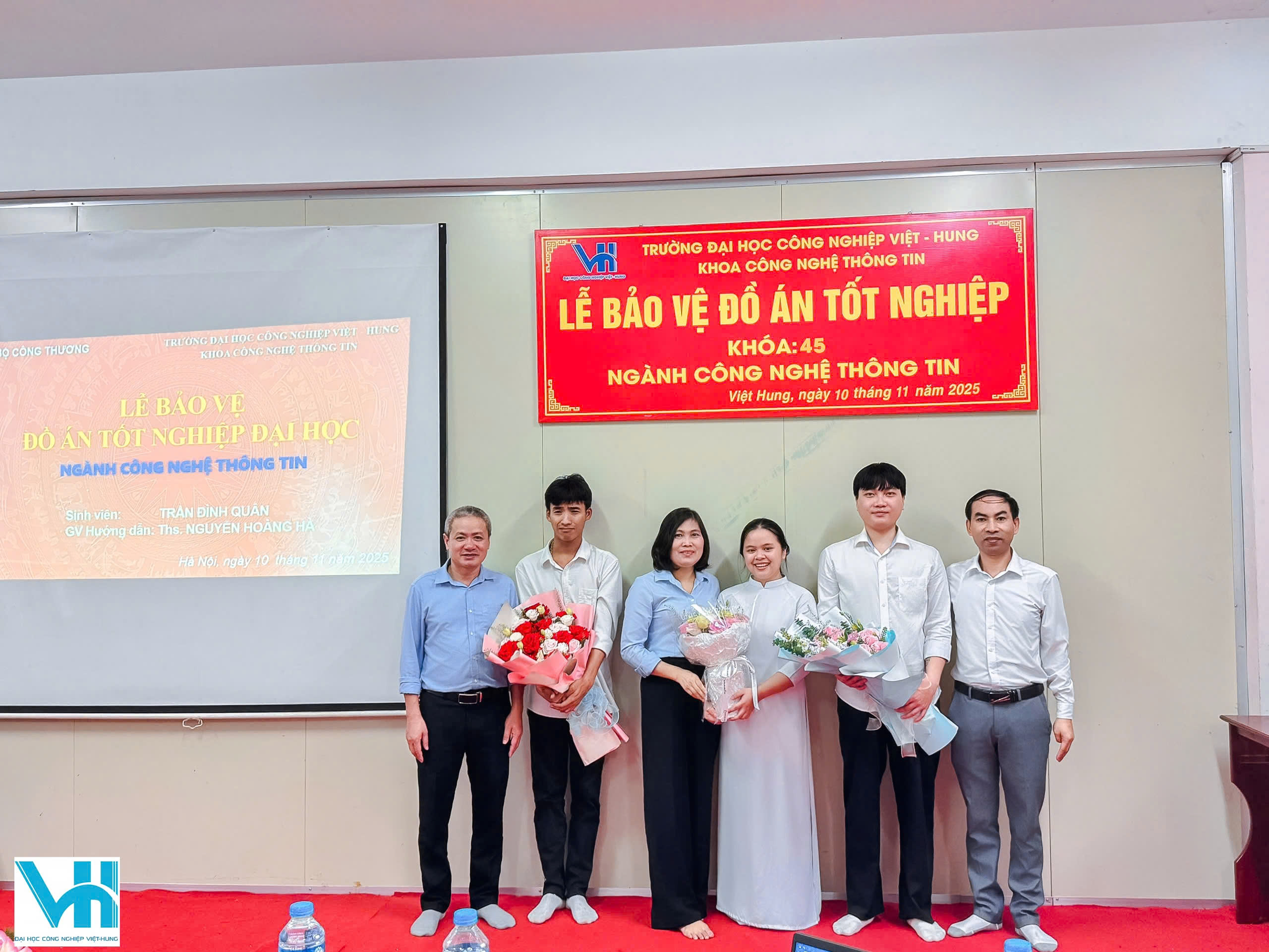 Sáng ngày 10 tháng 11 năm 2025, tại Trường Đại học Công nghiệp Việt – Hung, Khoa Công nghệ Thông tin đã long trọng tổ chức Lễ bảo vệ đồ án tốt nghiệp cho sinh viên K45 ngành Công nghệ thông tin khóa học 2021 – 2025. Buổi lễ diễn ra trong không khí trang trọng, cởi mở và tràn đầy cảm xúc, đánh dấu một cột mốc quan trọng trong hành trình học tập và rèn luyện của các em sinh viên.