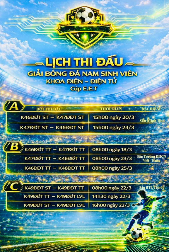 Lịch thi đấu của giải được thông báo rộng rãi tới các chi đoàn và đăng tải trên các kênh thông tin của khoa, giúp sinh viên dễ dàng theo dõi thời gian, địa điểm thi đấu của từng trận. Điều này góp phần tạo nên sự chuyên nghiệp trong công tác tổ chức và tăng thêm sự hào hứng cho các đội tham gia cũng như cổ động viên theo dõi giải đấu. Các trận đấu sẽ diễn ra trong không khí hào hứng, nhiệt huyết với tinh thần thi đấu trung thực, cao thượng tại 3 sơ sở đào tạo của trường. Hứa hẹn nhiều pha bóng đẹp, kịch tính đã mang lại những giây phút sôi động và hấp dẫn, thu hút sự cổ vũ nhiệt tình từ đông đảo cổ động viên. Thông qua giải đấu, Liên chi đoàn Khoa Điện - Điện tử tiếp tục khẳng định vai trò trong việc tổ chức các hoạt động phong trào bề nổi văn hóa, văn nghệ, thể dục thể thao của khoa thiết thực góp phần phát triển toàn diện cho sinh viên cả về thể chất lẫn tinh thần.