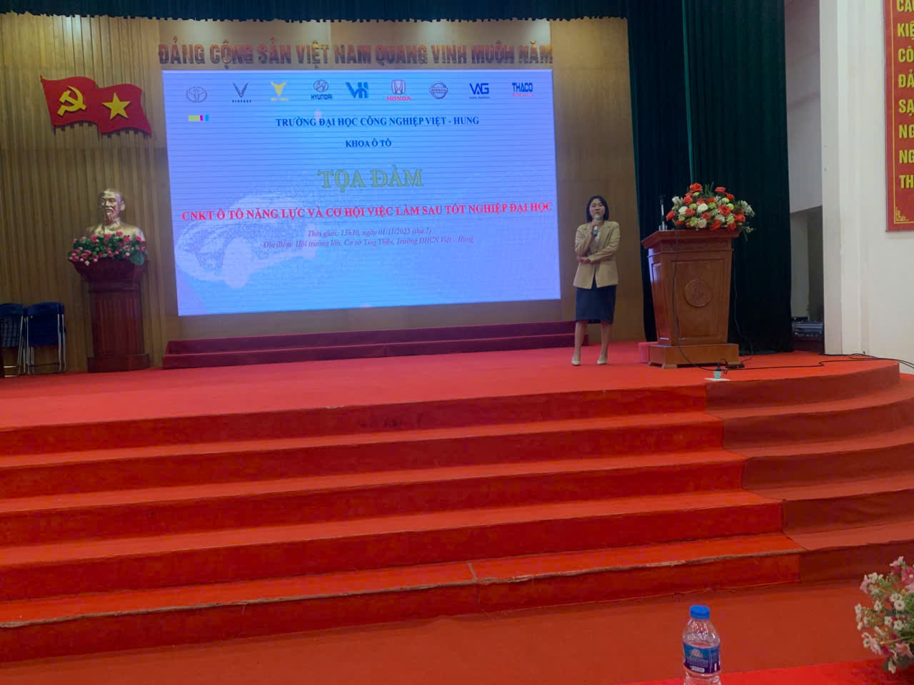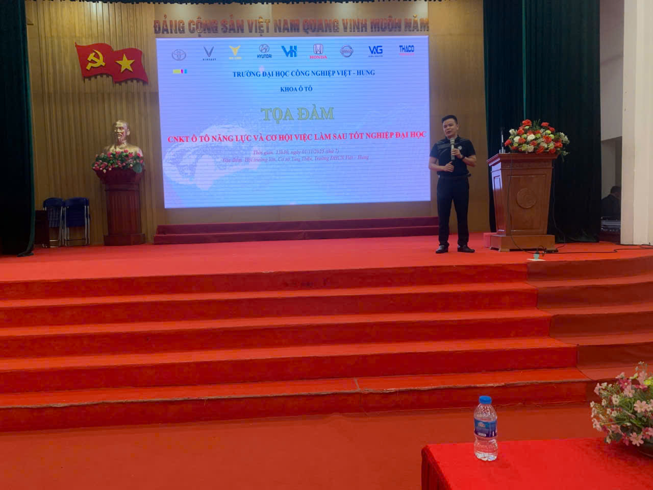 Sáng ngày 01/11/2025 Khoa Ô tô đã tổ chức Tọa đàm “Ngành Công nghệ kỹ thuật Ô tô – Năng lực và cơ hội việc làm sau khi tôt nghiệp” với sự tham dự của lãnh đạo các công ty về lĩnh vực Ô tô trên địa bàn Hà Nội cùng các thầy cô và sinh viên Khoa Ô tô Trường ĐHCN Việt – Hung. Tọa đàm được tổ chức nhằm phân tích thực tế yêu cầu của doanh nghiệp, làm rõ năng lực cốt lõi mà sinh viên cần có để đáp ứng môi trường nghề nghiệp, đồng thời định hướng chiến lược nghề nghiệp bền vững cho sinh viên khi theo học ngành Công nghệ Kỹ thuật Ô tô tại Trường Đại học Công nghiệp Việt – Hung.