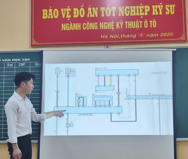 Buổi bảo vệ diễn ra nghiêm túc, đúng quy trình với sự tham gia của hội đồng chấm gồm các giảng viên có chuyên môn sâu trong lĩnh vực ô tô. Tại đây, sinh viên đã trình bày các đề tài nghiên cứu và ứng dụng kỹ thuật, tập trung vào các nội dung như hệ thống điện – điện tử ô tô, chẩn đoán kỹ thuật, mô hình điều khiển và cải tiến hệ thống trên xe hiện đại.