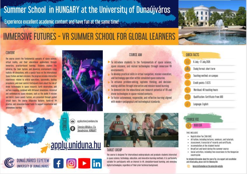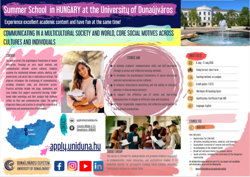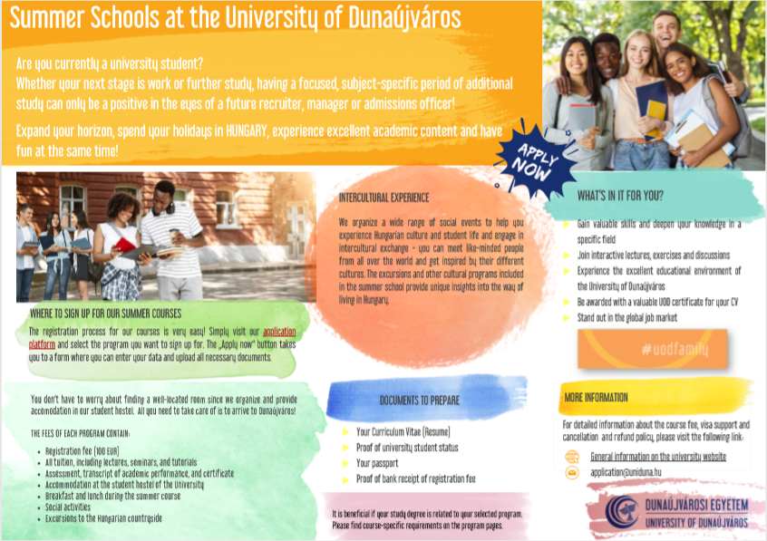 Thực hiện chương trình ký kết hợp tác giữa 02 Nhà trường và tăng cường cơ hội học tập, giao lưu học thuật quốc tế và phát triển kỹ năng toàn cầu cho sinh viên, Phòng Hợp tác quốc tế trân trọng thông báo đến sinh viên về Chương trình Trại hè quốc tế 2026 tại Hungary do Trường Đại học Dunaújváros (UOD) tổ chức.